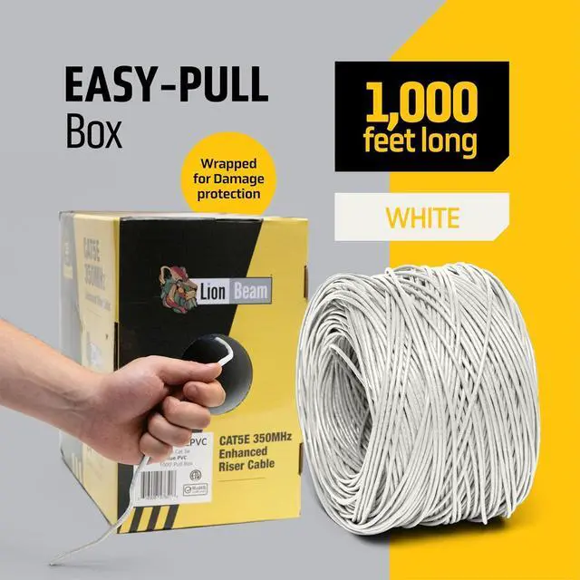 Premium Cat5e Ethernet Cable Bulk Spool The Lion Beam 1000ft Cat5e Ethernet cable box is engineered for high-speed wired connections in both residential and commercial settings. Dimensions: 1000ft (305m) pull box. This Cat 5e Ethernet cable bulk spool supports up to 350MHz bandwidth and speeds of 15Gbps, ensuring smooth data transfer for gaming consoles, modems, routers, CCTV security systems, and office networks.