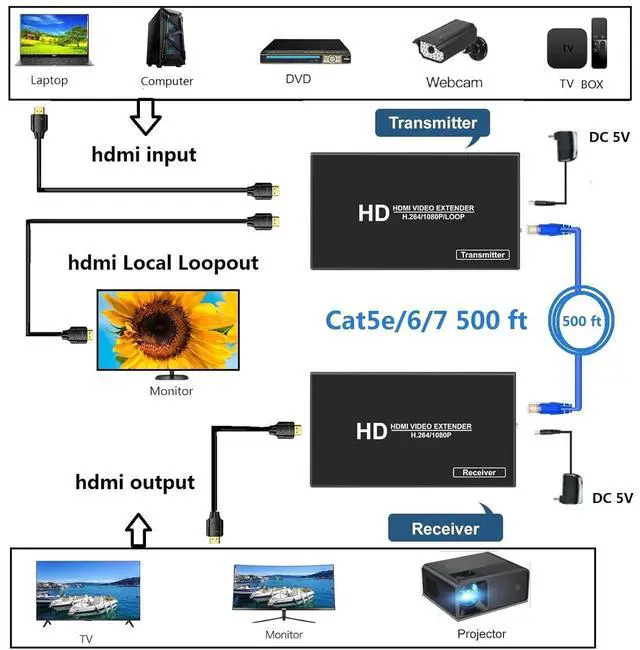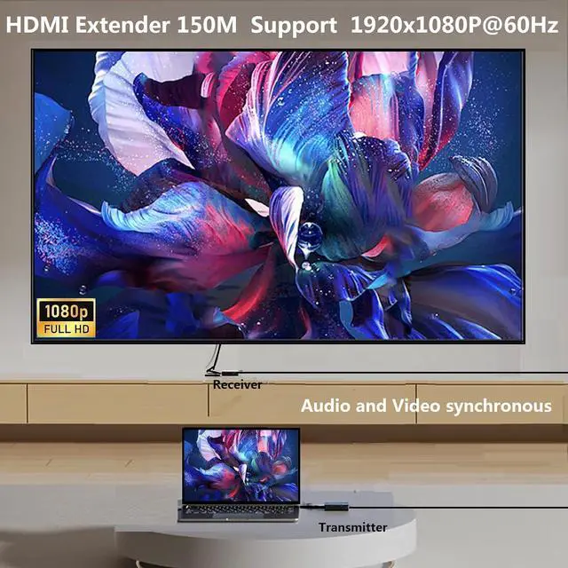 hdmi extender over cat5e/6:The HDMI extender can simultaneously transmit high resolution 1080P video and audio through an oxygen-free copper CAT6 cable, up to 500 ft/150m, no delay, audio and video synchronization, Perfect for home/office for PC, Game Consoles, Blu Ray Players/Media Players ,outdoor or indoor, Good choice for projects and video conferences.