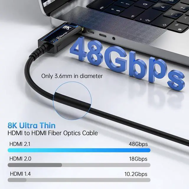 Ultra High Speed 48Gbps HDMI-The 8K Fiber Optic HDMI 2.1 Cable is capable of high speed transmission with 48Gbps bandwidth for better visual experience. Backwards compatibility with all HDMI versions including HDMI 1.3/ 1.4/ 2.0/2.1,4K / 8K, and support high speed 8K 48Gbps transmission.