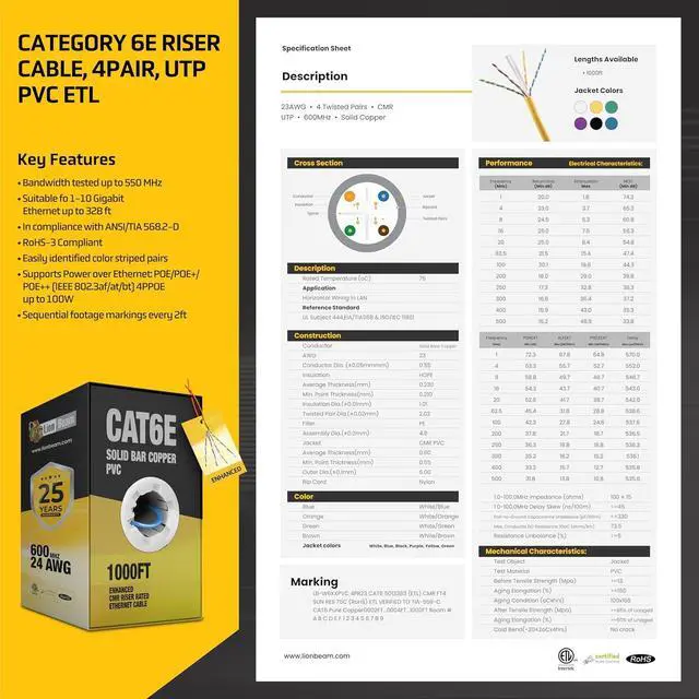 Certified & Warranty Protected Cat Ethernet Cable All Lion Beam Cat6 Ethernet Cables are CSA and ETL Certified, TAA and RoHS Compliant, flame-resistant (CMP IEC 60332-3 Cert), and barcode traceable for quality assurance. Our Cat 6 Ethernet cable is available in multiple colours, including white, black, blue, green, and yellow. A full 25-year warranty backs each 1000ft bulk Cat6e cable box for total peace of mind.