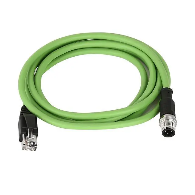 M12 to RJ45 Ethernet CableFeatures RJ45 Male connector on one end and M12 D-Code 4-pin male connector on the other. Built with Cat5e 26 AWG cable, Green PUR jacket, and flame-retardant insulation. Operating temperature range: -40°C to +85°C. IP67 rated and 100% shielded. Professional factory support for custom wire lengths, connector types, and specifications.