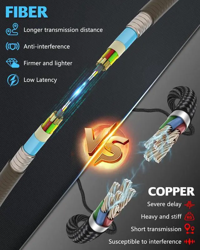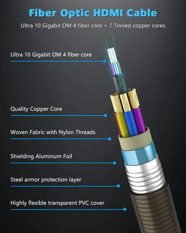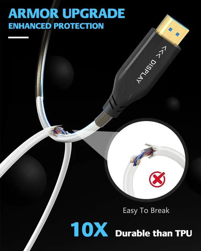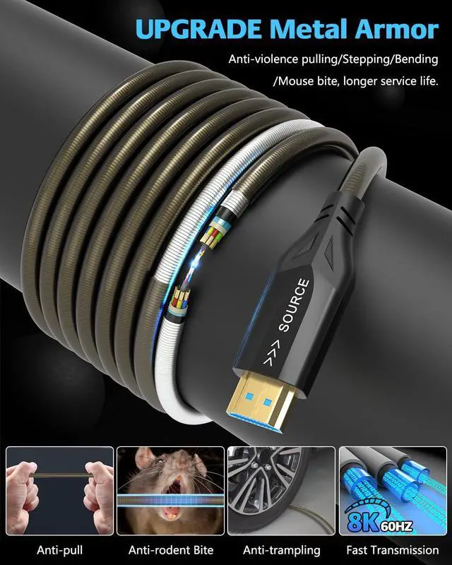 Upgraded Armor Metal Fibre Optic HDMI Cable: 8k fiber optic HDMI cable adopts a special armored structure with a strong protective layer wrapped around the outside, which has a high strength resistance to pulling and compression. Whether in a complex wiring environment, or by accidental extrusion, pulling, can ensure the safety of the cable, not easy to damage, longer service life. The armor layer can also effectively shield the external electromagnetic interference, to ensure the lossless transmission of photoelectric signals, so that you can get stable, clear images and sound in a variety of environments.