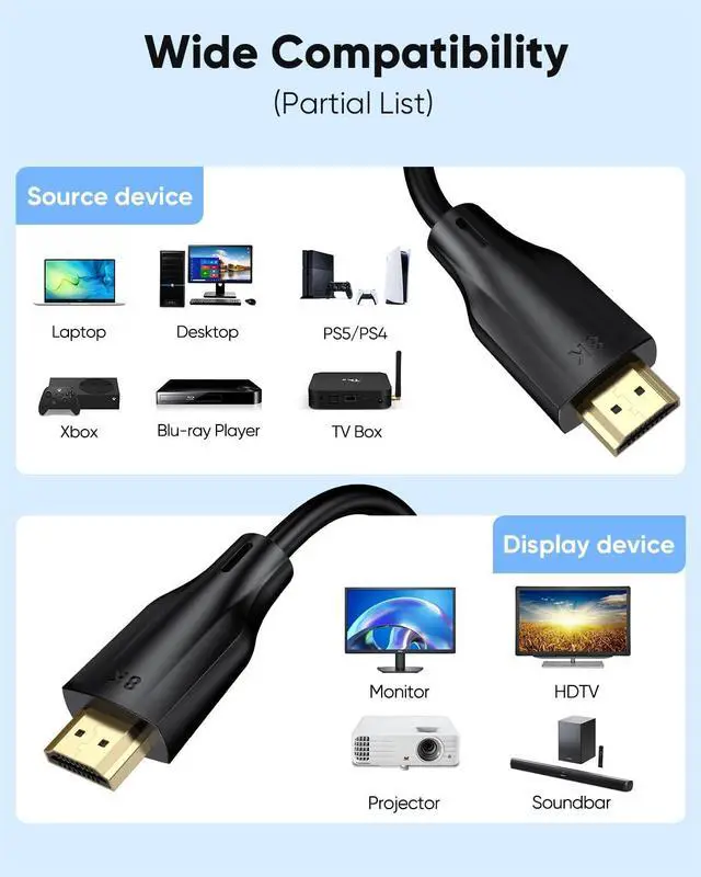 Universal Compatibility: HDMI Cord are flexible and easy to bend and twist for perfect compatibility with all leisure and specialized equipment with HDMI ports, including: Laptop, Monitor, PC, Graphics Card, Projector, Soundbar, Fire TV, Apple TV, PS5/PS4, Xbox X/S/One/360, DVD Blu-ray player, HDTV, etc