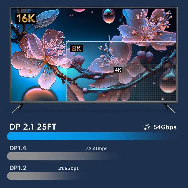 25FT DisplayPort Cable 2.1: The Dbilida 16K DisplayPort 2.1 Cable is engineered for high-resolution displays, delivering 16K@30Hz with DSC, 8K@120Hz, 4K@240Hz/165Hz/120Hz/144Hz, 2K@360Hz. It is compatible with Dynamic HDR, HDCP 2.2, and DSC 1.2a, and maintains full backward compatibility with earlier DisplayPort versions including 2.0, 1.4. The dp cable also delivers flawless audio transmission for uncompressed 7.1, 5.1, and 2.0 channel sound, and supports 3D stereo imaging.