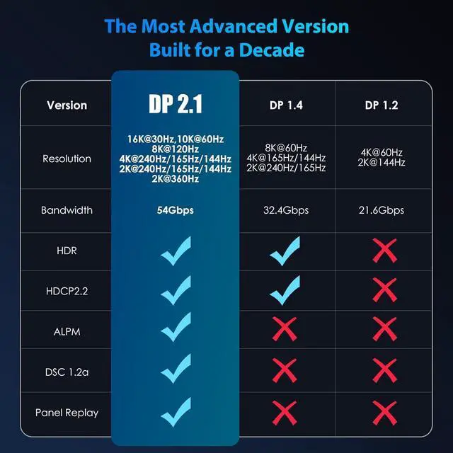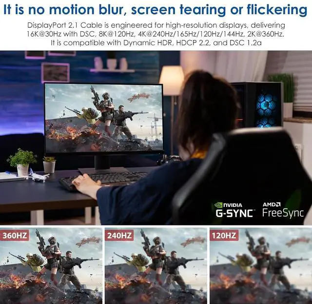 54Gbps Bandwidth: Engineered for compatibility with all popular graphics cards and monitors, this 16K DisplayPort 2.1 cable delivers a superior 54Gbps bandwidth (HBR3) and DSC 1.2a support, far surpassing the capabilities of standard 4K/8K cables. It unlocks new levels of immersion with Dynamic HDR for deeper shadows and details, 32-bit audio to pinpoint critical in-game sounds like footsteps, especially in FPS and 3A masterpieces and MTS for seamless multi-screen setups. It's the all-in-one cable built for the next decade of gaming and entertainment.