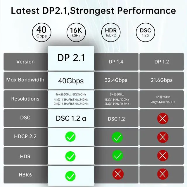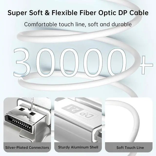 [email protected] Fiber Optic DisplayPort Cable 2.1Displayport 2.1 cable supports high resolution 16K@30Hz, 8K@60Hz, 4K@240Hz/120Hz/144Hz. DP 2.1 cable provides 40Gbps bandwidth.