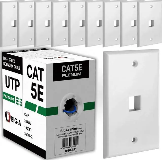 Big-A Cat 5e Plenum Cable 1000ft Blue 350MHz for High-Speed Networking + 1 Port Keystone Wall Plate 1 Gang Ethernet Wall Plate Compatible with HDMI Keystone - White Bundle