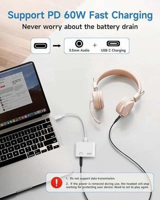 2 in 1 USB C to 3.5mm Audio Adapter USB C audio adapter splits your USB-C port into a PD compatible USB C port and a 3.5mm audio jack, allowing you to listen to music, play games, calling, driving or watch videos while fast -charging your device.It also supports volume control while fast-charging your device