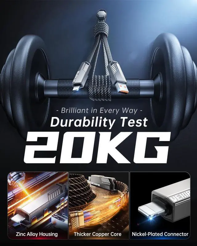 60W High-Speed Charging: Our 15 ft multi-charging cable is equipped with 60W charging power, allowing you to get the power required for one day in 35 minutes. Note: To achieve 60w fast charging, please be equipped with a charging adapter of more than 60W