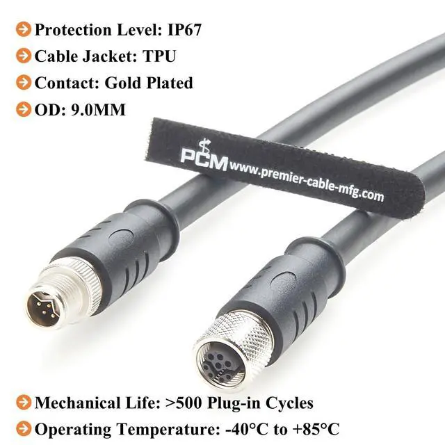 Product Parameters Connector A: M12 Y-Code 8Pin Male; Connector B: M12 Y-code 8-pin Female; Rated Current: 0.5A (Signal), 6A (Power); Rated Voltage: 60V AC/DC; OD: 9.0MM; Length: 3M/9.84FT.