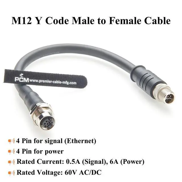 2-in-1 Power & Ethernet M12 Y-Coded Power and Data Cable, 4 pin for signal (Ethernet), 4 pin for power.Supports 100 Mbps CAT5e Ethernet and 6A power transmission.