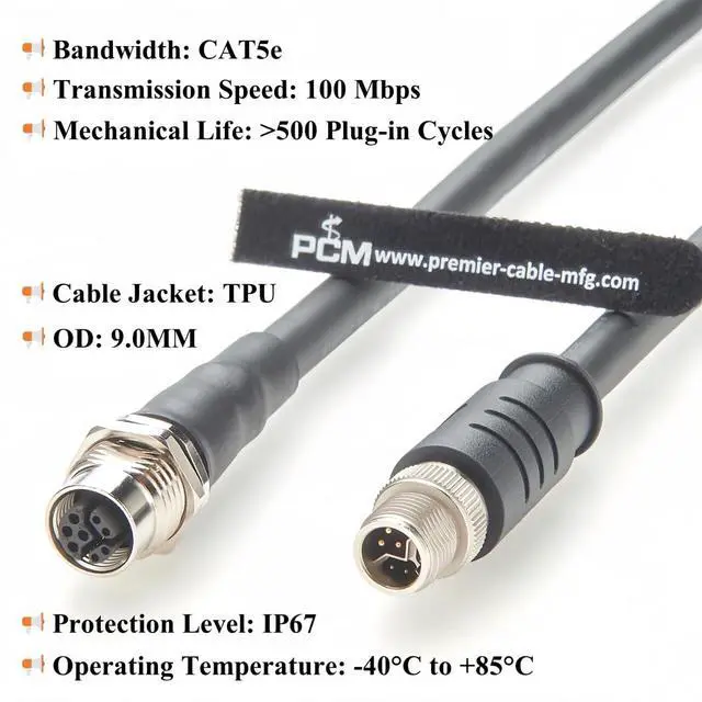 Rugged & Waterproof Micro-Change M12 Y Code Extension Cable, with nickel-plated housing, TPU Jacket and gold-plated contacts, IP67 waterproof, >500 mating cycles, ensure secure connections in harsh conditions.