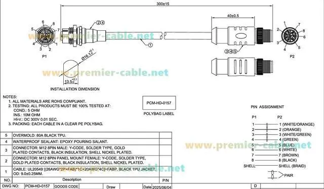 Shielded Cable PROFINET M12 Extension Cable Constructed with shielded twisted pairs (26AWG*2P + FAB),minimize electromagnetic interference (EMI), ensure stable data transmission.