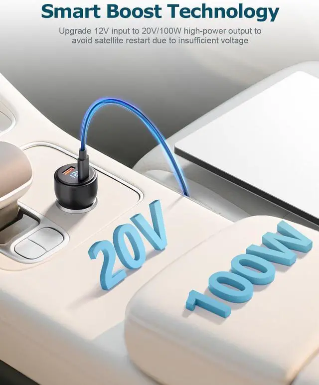 What You Will Receive1 * 10FT starlink mini usb c to dc power cable; 1 * cigarette lighter adapter 12v-24v . Starlink mini car charger adopts intelligent boost technology, which can output a maximum power of 20V/100W when the input voltage is greater than 12V. It supports three in one power supply: charging starlink mini dish, USB-C (100W), and USB-A (18W) devices.