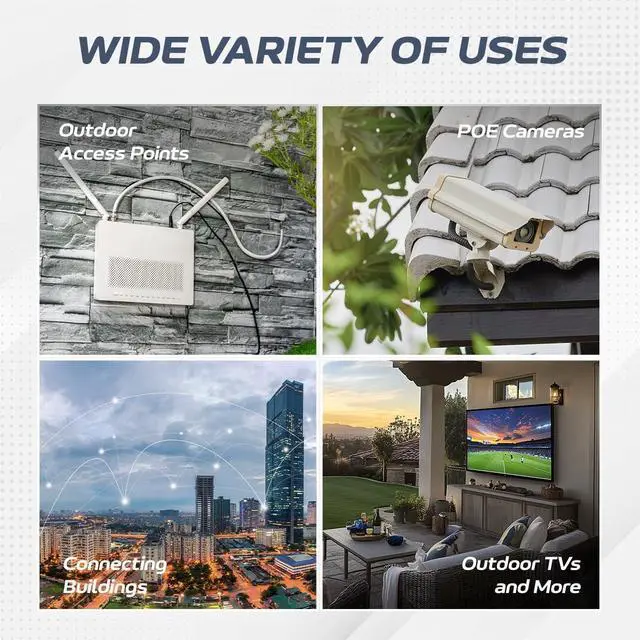 Perfect for Outdoor Networking: Commonly used for connecting security cameras, access points, and networking devices between buildings or over large outdoor areas.