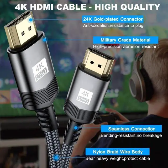 Braided HDMI Cable Ultra-durable nylon-braided with a bend lifespan of 10000+, Pure copper core manufacturing; Built with gold-plated connectors and top imported chips to ensure high-speed and flawless signal transmission