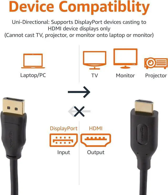 IMPORTANT: This cable is not USB-A compatible. Signal direction is one-way only: DisplayPort (computer) HDMI (display)