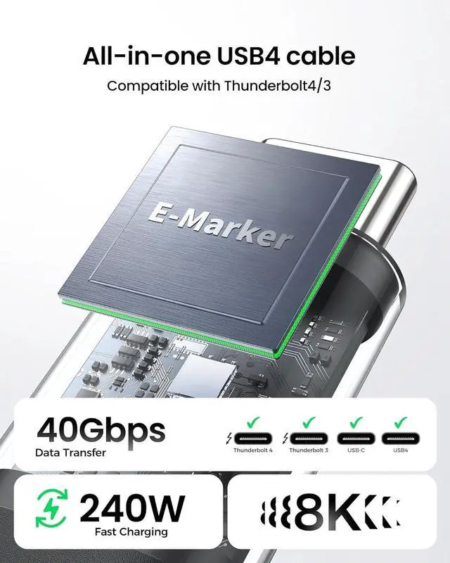 Future-proofed CompatibilityThe USB 4 cable fully supports the function of Thunderbolt 4. Backward compatible with Thunderbolt 3, USB 3.2 Gen 2, USB 3.2 Gen 2 x 2, USB 2.0. It works seamlessly with all Thunderbolt 4 / 3 / Type-C devices. Compatible with Apple Studio Display, Mac Studio, MacBook, Surface, iPad Pro, iPhone 17/16, docking station, SSD, eGPUS, power bank, GaN charger, etc.