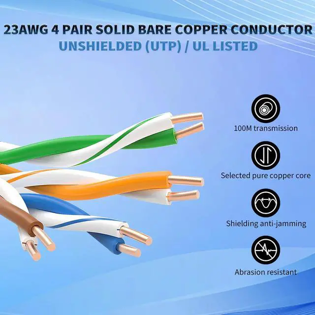High PoE compatibility: The 23AWG solid bare copper conductors of this unshielded (UTP) cable support PoE++ (4PPoE) IEEE PoE standards 802.3af/at/bt, making it suitable for gigabit and 10-gigabit ethernet