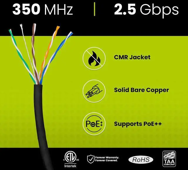 [High Performance Network Cable] This riser rated cat 5e cable is 24 AWG with 4 pairs (8 conductors). Suitable for 1 and 2.5 Gigabit (2.5GBASE-T) speeds up to 328 feet. Bandwidth tested up to 350 MHz. Supports Power over Ethernet: PoE/PoE+/PoE++ (IEEE 802.3af/at/bt) 4PPoE up to 100W.