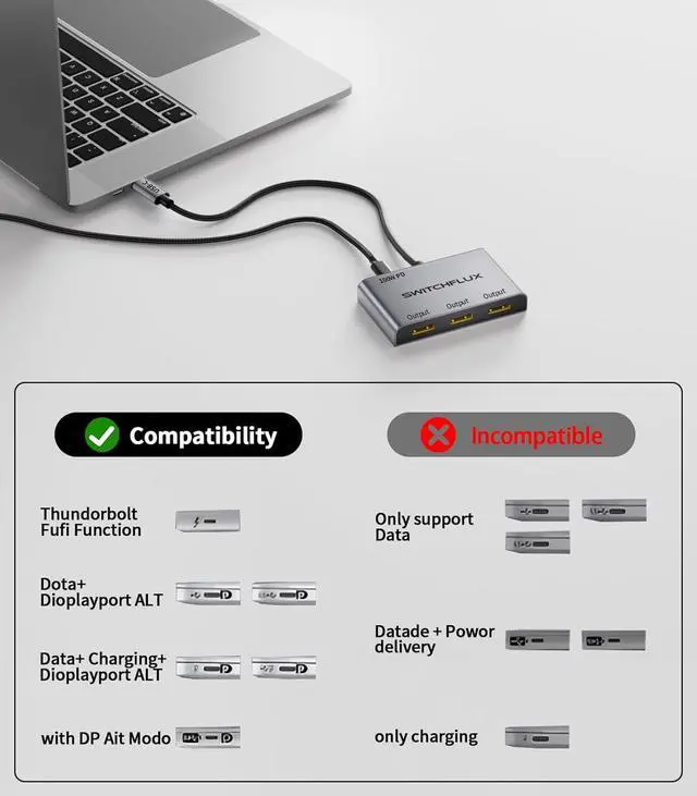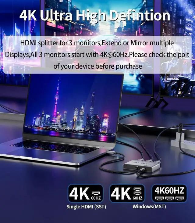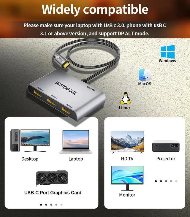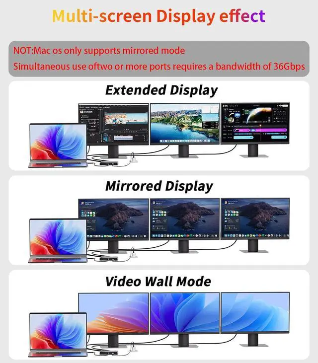 CompatibilityPlease ensure your laptop/PC is equipped with a full-featured Thunderbolt 3/4 port or a USB 3.0 (or higher) port supporting DP Alt Mode. To achieve 4K 60Hz output on all 3 ports simultaneously, the bandwidth must reach 36Gbps or higher. Compatible with graphics cards featuring a USB-C port, such as NVIDIA RTX 2060, AMD RX 6600 XT, or higher, as well as computers with USB-C ports supporting these specifications.
