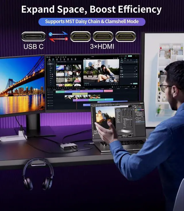 Multi-Screen Display SolutionSWITCHFLUX USB-C to 3 HDMI Adapter extends your computer monitor by mirroring or expanding USB-C signals from a single source to three HDMI monitors, displaying the picture in 4K60Hz clarity and transmitting high-quality audio and video at the same time. Increase your productivity and gaming experience with multiple screens!