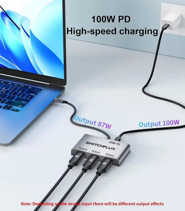 100W PD & Plug & PlayUSB-C to HDMI Adapter for 3Monitors Built-in 100W PD charging function allows you to quickly charge your device while expanding your display. Whether it's for office, entertainment or creative design, it's easy to handle. Support plug and play, no driver required, easy to realize multi-screen expansion. (Note: Do not use with any docking/hub/KVM. Only supports from one USB-C source device to HDMI display device.)