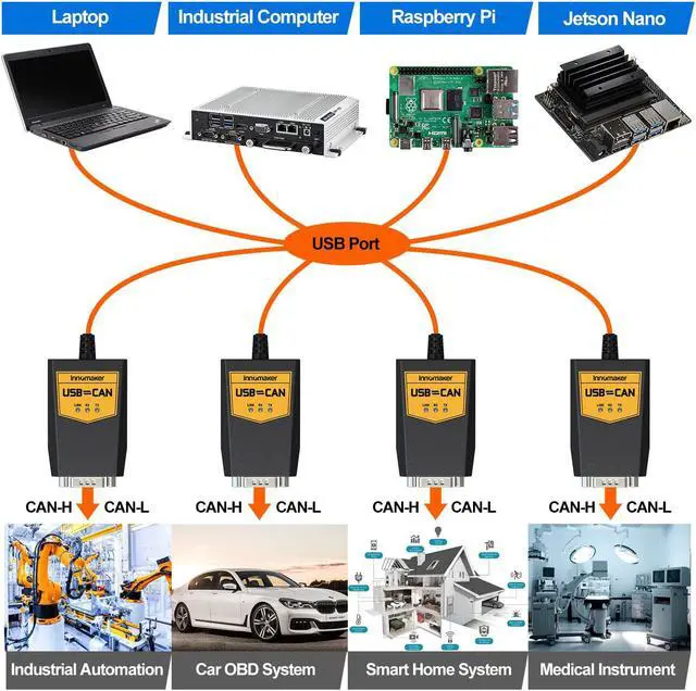 USB CAN Converter UniversalityThis USB to CAN cable connects Raspberry Pi 5/4/3B+/3/Zero, Jetson Nano, Tinker Board, all SBCs, desktops & laptops