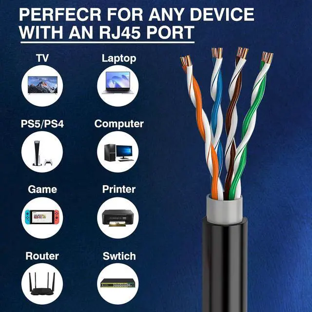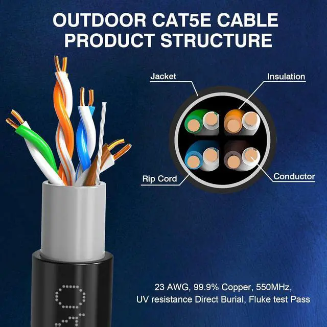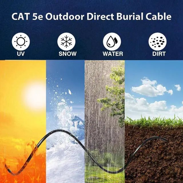 Outdoor & Direct Burial Rated: Ultra-durable Cat 5e Ethernet cable for direct burial! Gel-filled core ensures complete waterproofing, and the UV-resistant jacket withstands harsh sunlight. Run it underground or in conduit for a reliable connection anywhere. It can withstand temperature changes, sunlight, soil, water, snow, potential wildlife and other outdoor factors