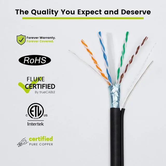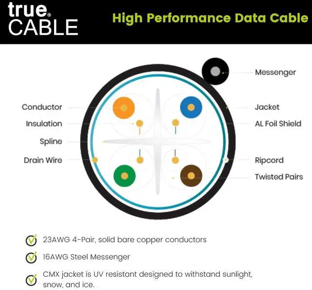 [Extreme Performance] The built-in 16AWG steel messenger makes this ideal for aerial runs. Overall aluminum (AL) foil shield - F/UTP reduces electromagnetic interference (EMI) and supports speeds 1 & 5 Gigabit up to 328ft and 10Gb up to 165ft.