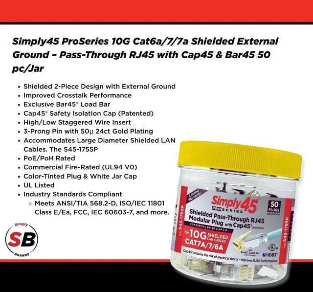 The video showcases the product in use.The video guides you through product setup.The video compares multiple products.The video shows the product being unpacked. Merchant Video Take your terminations to the next level with Simply45 PROSeries, the only HDBaseT approved pass-through RJ45 connectors. Featuring our patented Cap45, they prevent electrical arching and reduce crosstalk for superior performance and reliability.