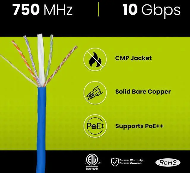 [Extreme Performance] Our Cat6A plenum Ethernet cable supports 1 and 10 Gigabit speeds up to 328ft. Bandwidth tested up to 750MHz. Supports Power over Ethernet: PoE/PoE+/PoE++ (IEEE 802.3af/at/bt) 4PPoE up to 100W.