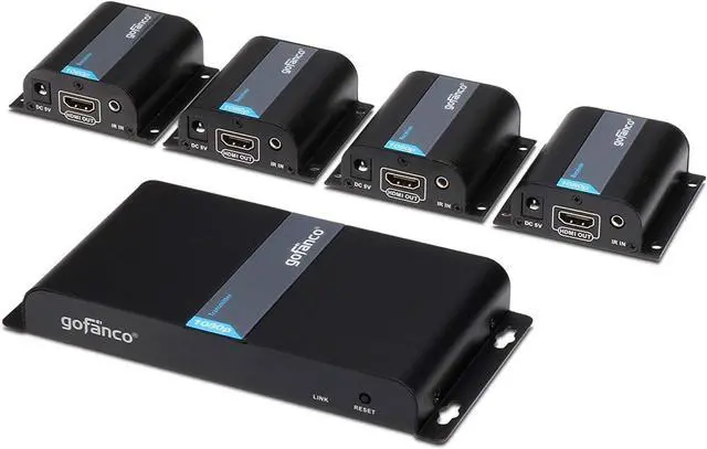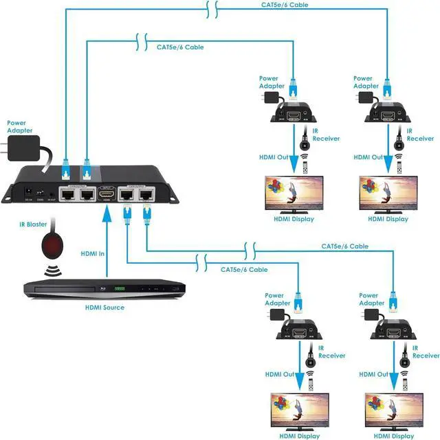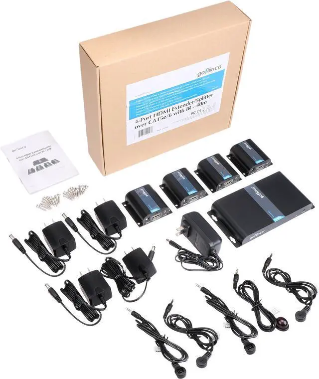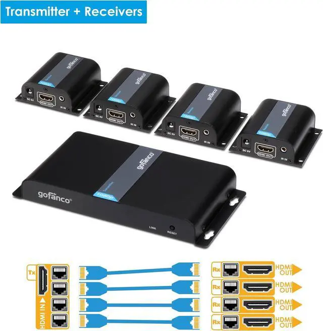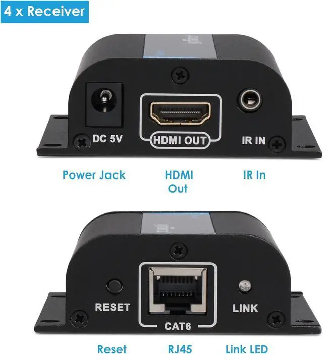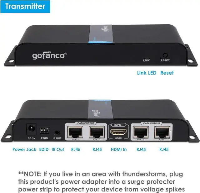 1x4 HDMI SPLITTER EXTENDER KIT Includes 1 Transmitter and 4 Receivers. Extend and distribute 1 HDMI source to 4 HDMI displays over CAT5e/6/7 simultaneously. **NOTE: If you live in an area with thunderstorms, plug this product's power adapter into a surge protecter power strip to protect your device from voltage spikes.