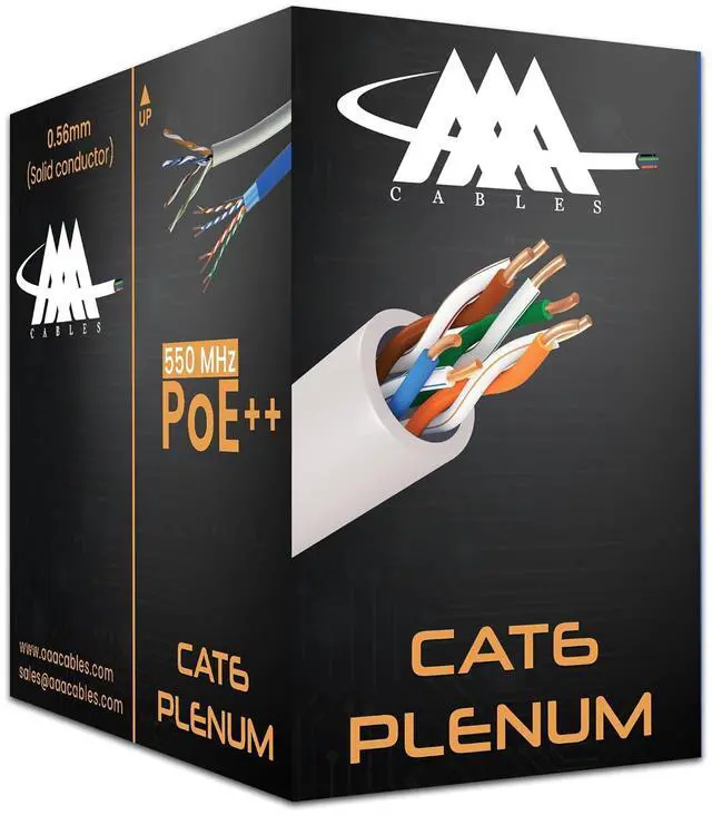 AAA Cables Cat6 plenum cable 1000ft rated Ethernet cable is 23 AWG. Suitable for Lightning fast 1 Gigabit and 10-Gigabit Ethernet. Bandwidth tested up to 550 MHz