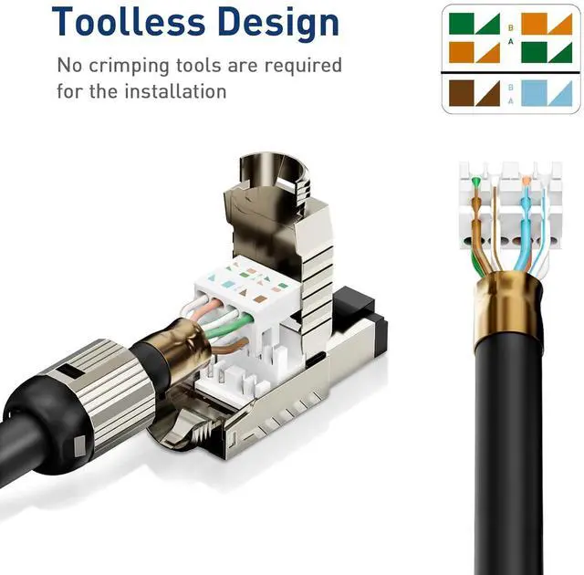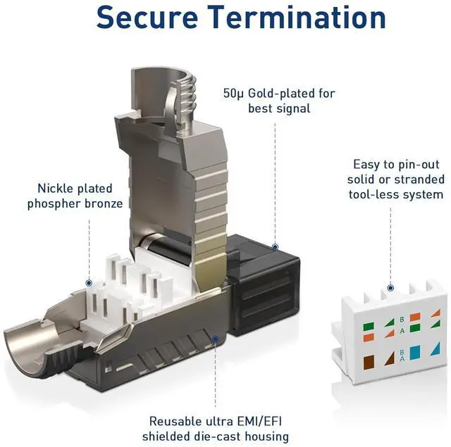 Effortless Installation: Our RJ45 connectors feature a tool-less, open-hinged design that makes it easy to place and terminate bulky shielded cables. Plus, theyre reusable, helping you cut down on waste