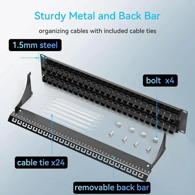 Sturdy Metal and back bar: 24 port module patch panel is made of sturdy 1.5 mm steel with no sharp edges. 4 screws and bolts were included in modular patch panel 24 port for assembling it into the rack. The removable back bar of cabinet patch panel is used for organizing cables using the included cable ties and takes some stress off the coupler.