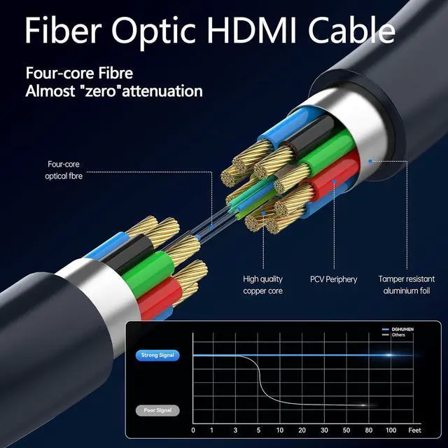 Durable Fiber Optic HDMI Cable : The long hdmi cable feature gold-plated connector sand zinc alloy housing and the tail's anti-bending design make it more durable, withstands over 10,000+ bending tests.
