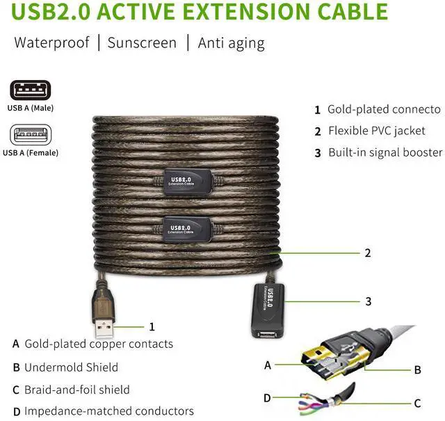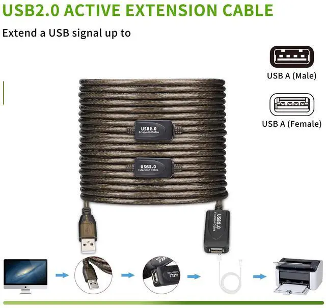 FLEXIBLE&DURABLE: With metal wire braid inside, the cable is flexible and resistant to pull and drag. The gold-plated connectors can bear more than 10000 times plug. The ABS and PVC case is anti-abrasive. UNIVERSAL COMPATIBILITY: The USB active extender is broadly compatible with Windows, Mac, Linux, Chromebook, and USB 2.0 peripherals including hard drives, USB hubs, mice, keyboards, flash drives, printers, and more.