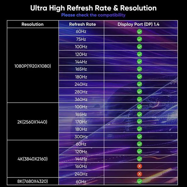 8K@60Hz Super Resolution DteeDck displayport 1.4 cable supports high resolution 8K(7680x4320)@60Hz, 5K(5120x2880)@60Hz, 4K@144Hz, 2K@240Hz, 1080P@240Hz, etc. High resolution makes the picture clearer. Backward compatible with DisplayPort 1.3/1.2/1.1 and 1.0. 8K Displayport Cable 1.4 works fully with FreeSync and G-Sync. Plug and Play. Also supports flawless audio pass-through in 7.1,5.1 and 2.0 uncompressed digital audio channels.