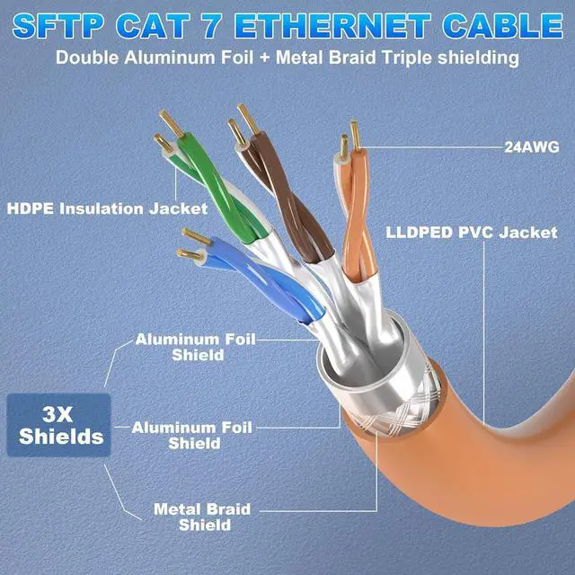 Cat 7 SFTP Triple Shielded Ethernet Cable: The Cat 7 shielded cable has an SFTP triple premium aluminum foil shield - each twisted pair has a separate aluminum foil shield, and a braided shield is added to the common shield than the shielded/unshielded twisted pair (F/UTP), which can minimize interference and crosstalk. Shielded cable can easily cope with home high-speed intranet, smart home and other needs of the network environment, to ensure that the enterprise network construction and high-end user data transmission is fast, clean and stable.