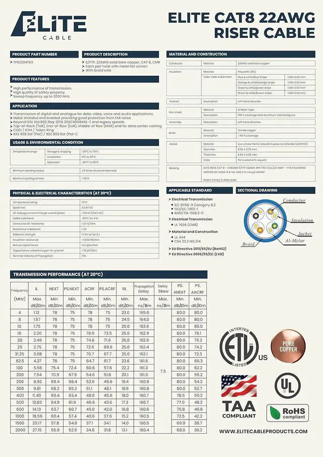 Future-proof design: With support for speeds up to 40 Gbps, the Cat8 riser CMR cable is ready for the next generation of networking and entertainment technology, ensuring that you won't have to upgrade again anytime soon.