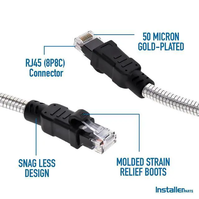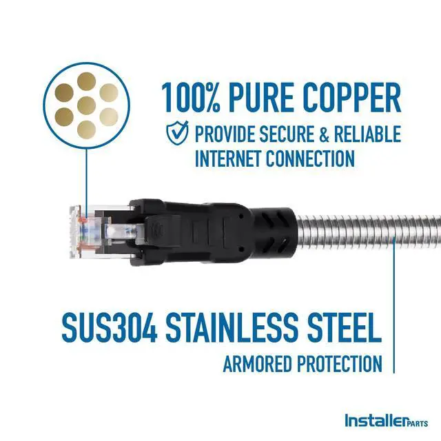 Armored Protection: Installerparts armored patch cable is wrapped in SUS304 stainless steel flexible jacket and is designed to resist outdoor weather conditions and protect connectivity and the cabling infrastructure from physical damage, moisture, UV and corrosion.