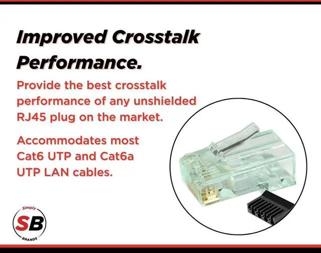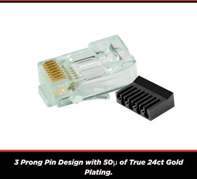 3 Prong Pin Design - All Simply45 pass-through RJ45 modular plugs use only 50µ 24ct gold plated 3-Prong pin design instead of a 2-Prong design as found on most other pass-through RJ45 modular plugs.