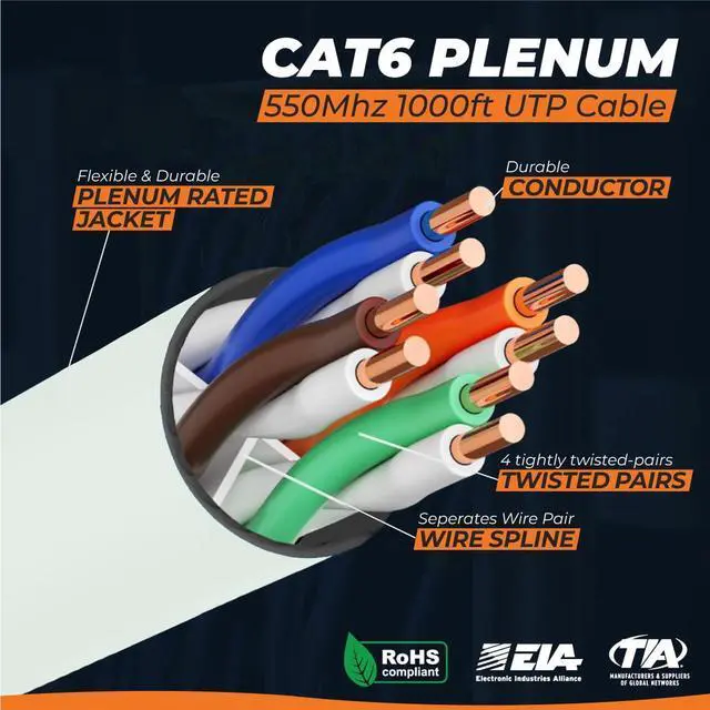 - :Our Cat6 plenum-rated Ethernet cable is designed for enhanced durability and conductivity. It ensures adherence to ANSI/TIA 568.2-D standards and is RoHS-3 compliant, providing you with peace of mind and a solid investment in your networking infrastructure.