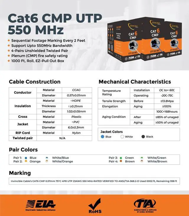 :Simplify your installation process with our Cat6 plenum-rated Ethernet cable, packaged in a tangle-free, easy pull box. Featuring easily identifiable color-striped 4-pair UTP (Unshielded Twisted Pair) conductors and sequential footage markings, this cable ensures precise usage tracking and smooth, flexible installation in any setting.
