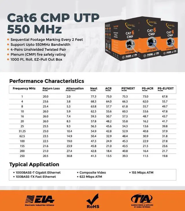 :Experience exceptional performance with our Cat6 plenum-rated Ethernet cable, tested for high data transfer rates. Designed for Gigabit Ethernet applications, this cable complies with building inspections and codes, features a crosstalk suppression spline for clean signals, and provides improved heat dissipation for PoE applications