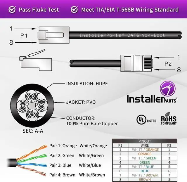 High quality 100% copper Installerparts patch cables are made f 100% bare copper wire with 50 micron gold plated RJ45 plugs. Our cables use high quality, long-lasting materials and feature A highly durable design at an affordable price.
