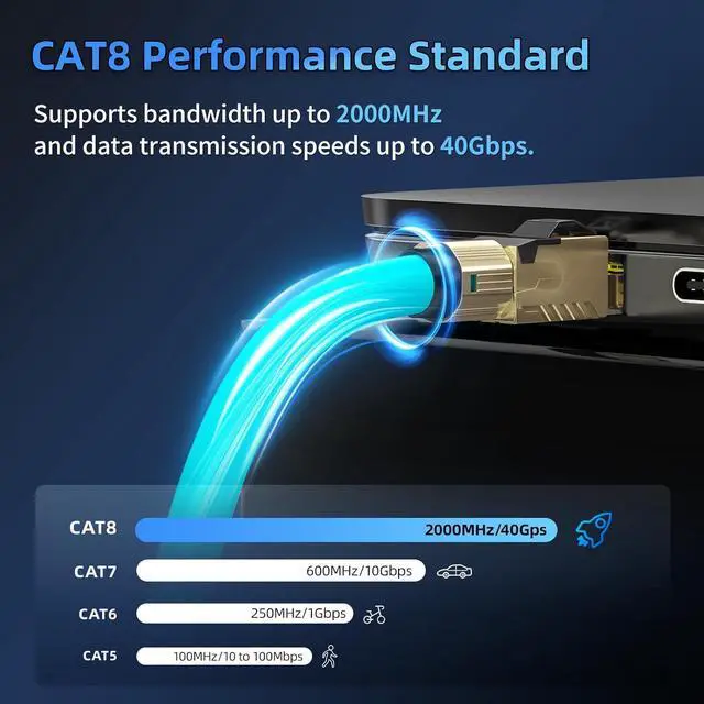 ULTIMATE SPEED & BANDWIDTH: Experience the pinnacle of networking with our Cat8 Ethernet cable. Delivers blistering speeds up to 40Gbps and a massive bandwidth of 2000MHz over distances up to 30 meters. Perfect for transferring massive files, powering smart homes, and building a future-proof network infrastructure that will serve you for years to come.