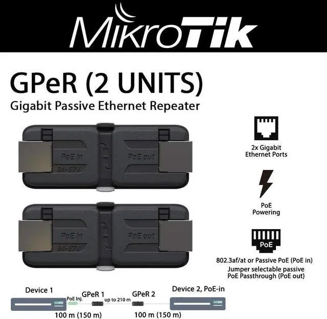The GPeR (2 UNITS) unit allows to extend Ethernet cable by additional hop (< 100 - 150 m to regular network devices, and up to 210 m to another GPeR unit) up to 1,500 m