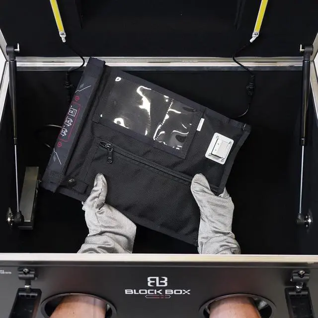 When using with the Blocker Locker, simply place a device inside the Charge & Shield Faraday Bag, connect the device to the inner side of the USB filter, close the bag, then connect the outer side of the USB filter to the power outlet inside the individual cabinet compartment. To extract data from a device, unlock the compartment, disconnect the power cord, remove the Charge & Shield Faraday Bag, and transfer it into a forensic faraday box, like the Mission Darkness BlockBox Lab XL. The bag can be easily opened inside the box (the magnetic NeoLok closure reduces faraday glove abrasion), while the device is passed into the shielded enclosure. Shielding and power are never compromised, providing a seamless process for investigators.
